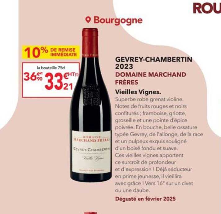 Découvrez dès maintenant la offre GEVREY-CHAMBERTIN 2023 DOMAINE MARCHAND FRÈRES dans le catalogue de METRO. Cette offre est valable du 02/10/2025 au 25/10/2025.