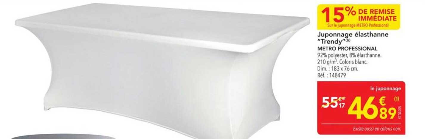 Découvrez l'offre exclusive sur le juponnage élasthanne "Trendy" de METRO, parfait pour tous vos événements. Avec une composition de 92% polyester et 8% élasthanne, ce produit allie esthétisme et résistance pour embellir vos tables tout en restant pratique.