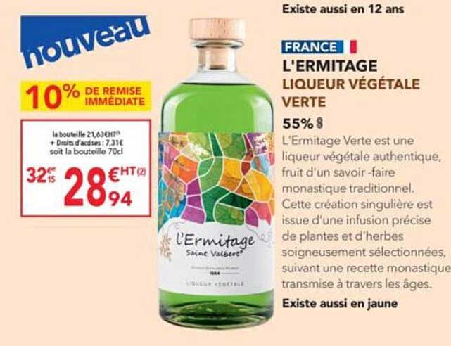 Découvrez le L'Ermitage, une liqueur végétale authentique qui saura ravir vos sens. Profitant d'une remise exceptionnelle de 10%, c'est l'occasion idéale de vous offrir ce produit unique, issu d'un savoir-faire monastique traditionnel. Avec un prix promotionnel de 28,94 € HT, cette liqueur de 70cl est un véritable trésor à ne pas manquer. Pourquoi ne pas en profiter pour agrémenter vos soirées entre amis ou autour de bons repas ?