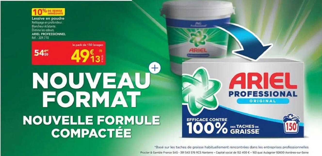 Découvrez l’offre incroyable d'Ariel Professionnel qui combine efficacité et praticité avec son nouveau format optimisé. Idéal pour ceux qui cherchent à allier pouvoir nettoyant et facilité d'utilisation, cette lessive en poudre ne manquera pas de vous impressionner. Grâce à sa formule concentrée, vos vêtements bénéficieront d'un nettoyage en profondeur et d'une blancheur éclatante.