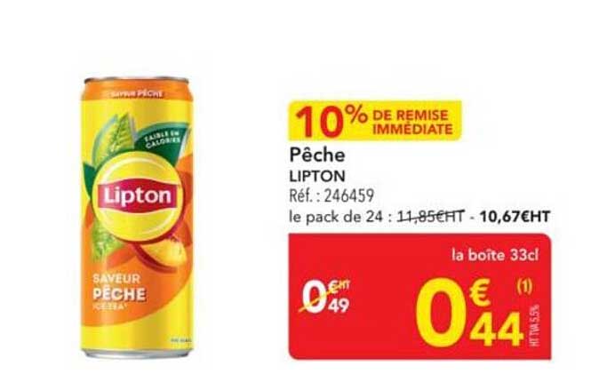 Venez découvrir la boisson rafraîchissante à la saveur pêche de LIPTON, parfaite pour tous vos moments de détente. Du 30 octobre au 26 novembre 2025, profitez d'une offre exceptionnelle avec une remise immédiate de 10% sur cette délicieuse boisson. Un pack de 24 canettes de 33cl est disponible à un prix défiant toute concurrence.