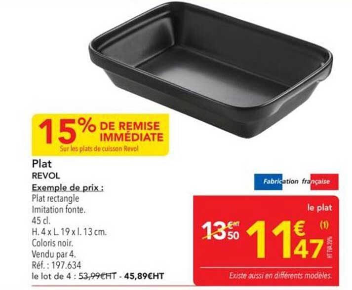 Découvrez l'incroyable promotion sur le plat de cuisson REVOl, actuellement en vente sur cette page ! Fabriqué en France, ce plat rectangle imite parfaitement la fonte, offrant à la fois style et fonctionnalité pour vos plats cuisinés. Avec une capacité de 45 cl, il répond à tous vos besoins culinaires, que ce soit pour rôtir, cuire ou servir.