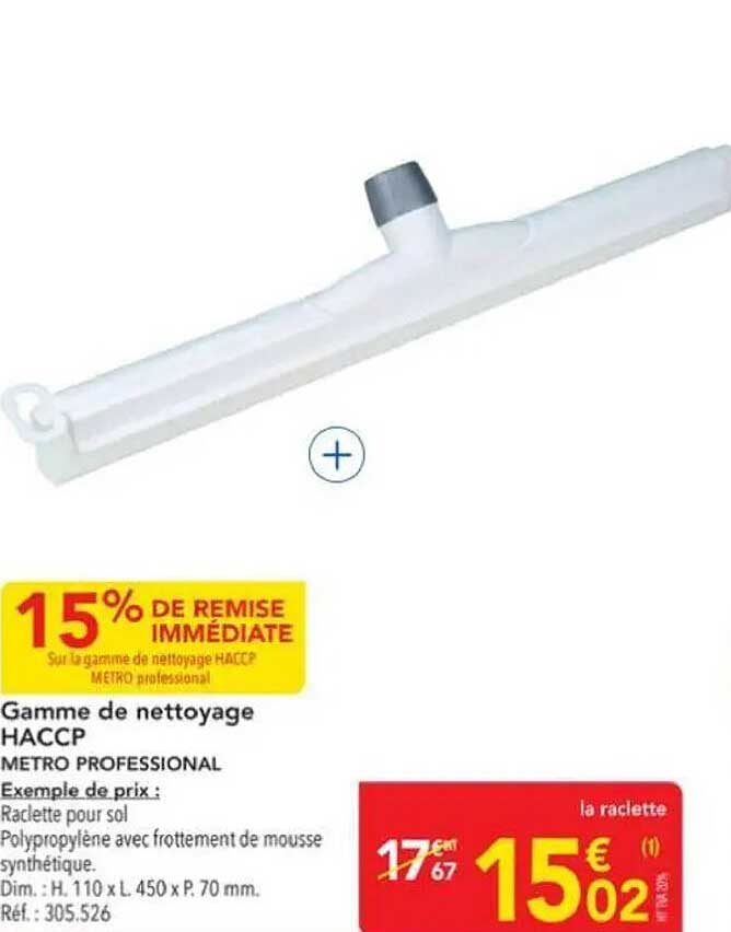 Découvrez cette promotion exceptionnelle sur la raclette pour sol de la gamme de nettoyage HACCP, proposée par METRO Professional. Idéale pour garantir une propreté optimale dans votre espace de travail, cette raclette performante vous facilitera le nettoyage tout en respectant les normes d'hygiène en vigueur.