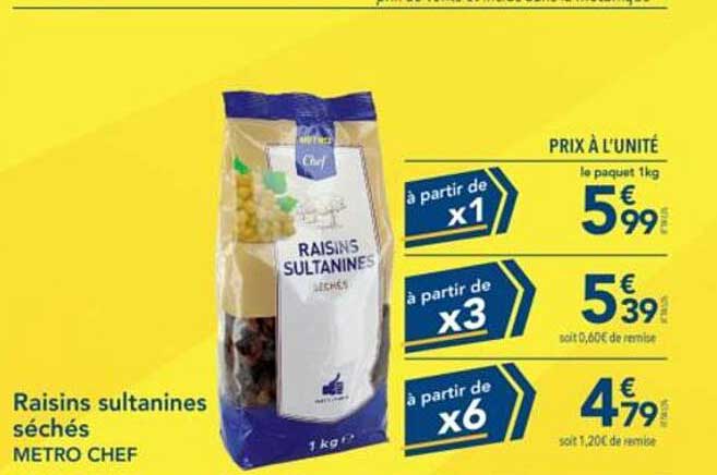 Découvrez une excellente opportunité d'acheter des raisins sultanines séchés de la marque Metro Chef, disponibles dans un sachet d'un kilogramme. Parfaits pour cuisiner, ces raisins apportent une touche sucrée et originale à vos plats. Cette offre, valable du 2 octobre 2025 au 26 novembre 2025, vous permet de profiter à des tarifs exceptionnels, rendant vos recettes encore plus savoureuses.