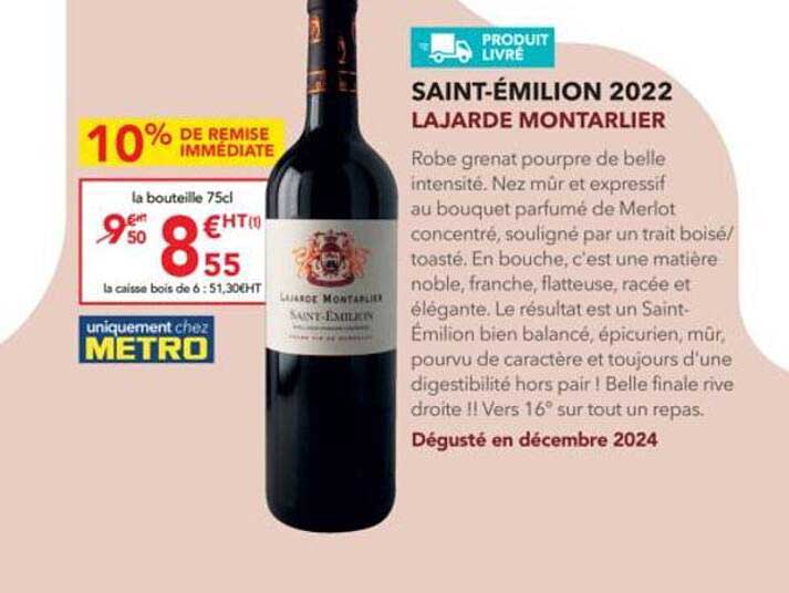 Découvrez dès maintenant la offre SAINT-ÉMILION 2022 LAJARDE MONTARLIER dans le catalogue de METRO. Cette offre est valable du 02/10/2025 au 25/10/2025.