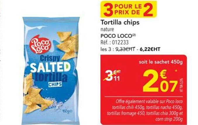 Découvrez l'offre exceptionnelle sur les chips tortilla POCO LOCO ! Profitez de cette promotion valable du 02 octobre au 29 octobre 2025. Pour le prix de deux sachets, repartez avec trois paquets de chips croustillantes et savoureuses, parfaites pour vos apéritifs ou vos petites faims.