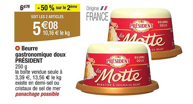 Découvrez la superbe offre de Beurre Gastronomique Doux Président dans le nouveau catalogue de Migros. En plus de cette offre, vous trouverez de nombreuses autres réductions attrayantes. Vous pouvez facilement commander le Beurre Gastronomique Doux Président en ligne via le site web de Migros ou l'acheter dans un magasin près de chez vous.