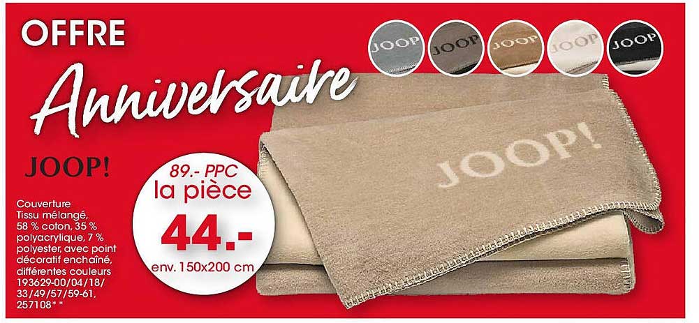 Découvrez une offre exclusive sur la couverture JOOP!. Actuellement disponible à un prix imbattable, cette couverture mélange habilement confort et style. Profitez de cette promotion pour embellir votre intérieur tout en vous offrant un doux cocon lors des nuits fraîches.