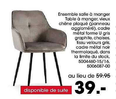 Actuellement, ces chaises sont proposées à seulement 39€, au lieu de 59,95€. Une économie de 20,95€ qui vous permettra d'investir dans d'autres éléments de décoration pour votre salon. Profitez de cette offre incroyable pour transformer votre salle à manger en un espace accueillant et moderne.