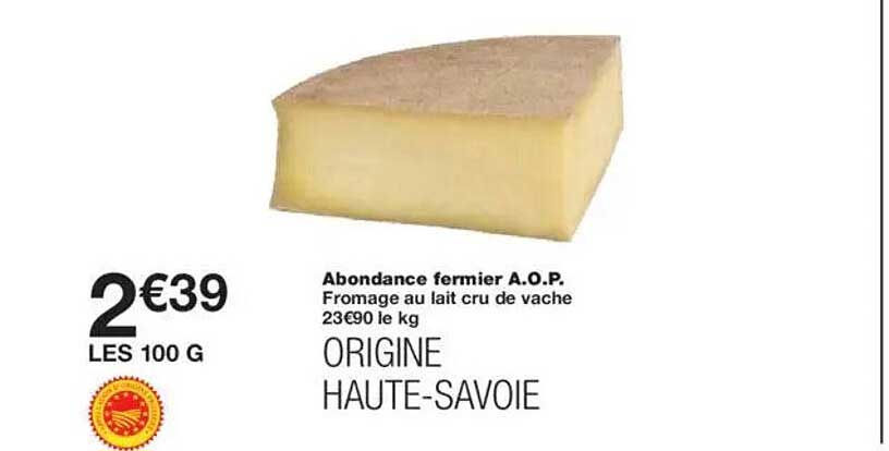 Découvrez l'étonnant fromage Abondance fermier A.O.P., un incontournable pour les amoureux de produits laitiers authentiques. Véritable symbole de la tradition fromagère française, ce fromage au lait cru de vache provient des paysages enchanteurs de Haute-Savoie. Avec son goût délicat et sa texture fondante, il saura ravir vos papilles à chaque bouchée. Profitez de cette offre exceptionnelle ici, du 4 au 19 octobre 2025.