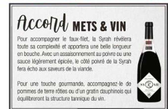 Vous cherchez le vin parfait pour accompagner vos plats ? Ne cherchez plus ! Cette offre, mettant en avant le vin Syrah, est idéale pour ceux qui apprécient une expérience gustative inoubliable. Avec ses arômes riches et sa complexité, ce vin saura rehausser vos repas, en particulier avec un faux-filet savoureux.