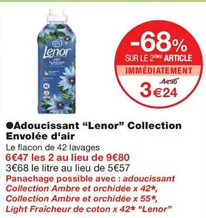 Découvrez l’adoucissant “Lenor” Collection Envolée d’air, un choix parfait pour obtenir du linge doux et délicatement parfumé. Actuellement, profitez d'une offre exceptionnelle : achetez deux flacons de 42 lavages au prix de 6€47, au lieu de 9€80 ! Cette promotion, valable jusqu'au 2 novembre 2025, est une véritable opportunité à ne pas manquer.