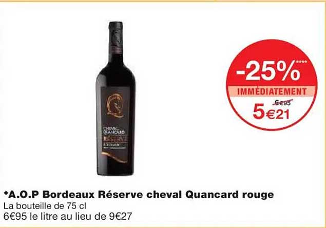Découvrez une offre exceptionnelle sur la Bordeaux Réserve cheval Quancard rouge, un vin qui ravira les amateurs de vin de qualité. Cette bouteille de 75 cl est idéale pour accompagner vos repas ou à savourer lors de vos soirées. Avec une réduction immédiate de 25%, c’est le moment parfait pour se faire plaisir sans culpabilité.