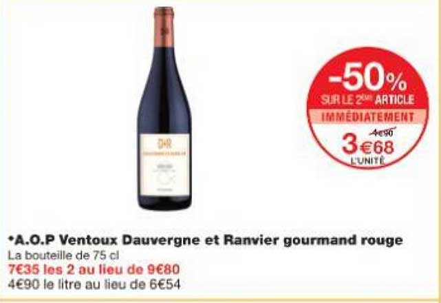 Découvrez l'excellence du vin avec l'A.O.P Ventoux Dauvergne et Ranvier gourmand rouge, une bouteille de 75 cl qui saura séduire les amateurs de bon goût. Profitez d'une promotion exceptionnelle, valable jusqu'au 6 avril 2025, pour savourer ce vin aux arômes riches et complexes. C'est l'occasion rêvée de remplir votre cave à vin d'une excellente qualité tout en réalisant des économies !