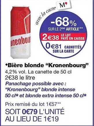 Vous cherchez une bonne bière blonde pour vos soirées ou vos repas entre amis ? Ne manquez pas la promotion exceptionnelle sur la bière Kronenbourg ! Disponible en canette de 50 cl, cette bière, avec ses 4,2 % vol., est parfaite pour se désaltérer tout en savourant un goût authentique.