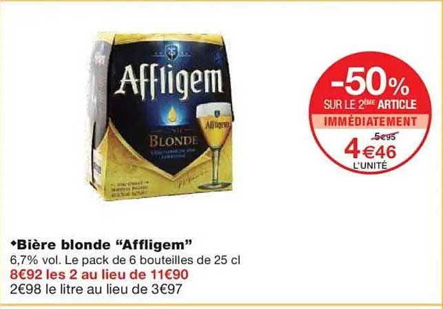 Découvrez l’offre exceptionnelle sur la bière blonde “Affligem”, un grand classique pour les amateurs de bières savoureuses. Avec sa douceur et son goût raffiné, cette bière est le choix idéal pour vos soirées ou vos moments de détente. Grâce à cette promotion, profitez d'un avantage vraiment intéressant sur votre prochaine commande.