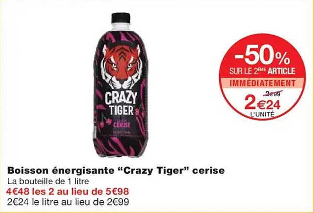 Actuellement, la boisson “Crazy Tiger” cerise est proposée à 4,48€ les 2 bouteilles au lieu de 5,98€, soit une économie de 1,50€. Profitez donc d’un tarif imbattable de 2,24€ par litre au lieu de 2,99€. C'est une opportunité à ne pas manquer !