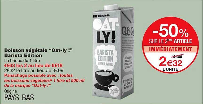 Découvrez dès maintenant la offre Boisson végétale "Oat-ly !" Barista Édition dans le catalogue de Monoprix. Cette offre est valable du 20/01/2025 au 02/02/2025.