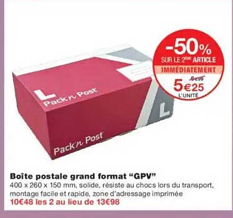 Découvrez dès maintenant la boîte postale grand format “GPV” qui allie solidité et praticité ! Conçue pour résister aux chocs durant le transport, cette boîte vous permettra d’expédier vos colis en toute confiance. C’est l’offre parfaite pour tous ceux qui souhaitent envoyer des objets en toute sécurité. Profitez de cette promotion exceptionnelle, valable jusqu’au 19 octobre 2025, pour vous équiper au meilleur prix !