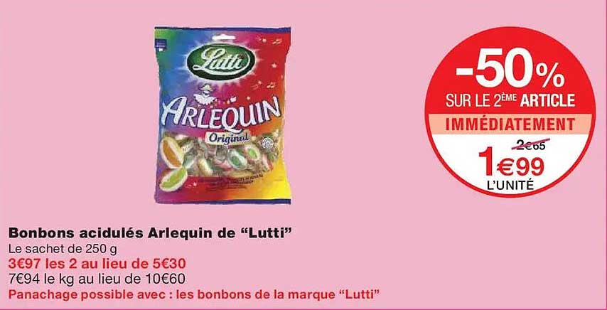 Dégustez les délicieux bonbons acidulés Arlequin de "Lutti" dans une offre exceptionnelle ! Profitez de cette promotion pour ravir vos papilles et celles de vos proches. Les Arlequins sont parfaits pour les petites faims ou pour agrémenter vos moments de convivialité.