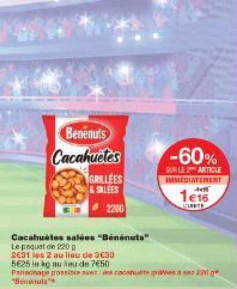 Découvrez l'offre de Cacahuètes Salées "Bénénuts" chez Monoprix! Cette offre fantastique est maintenant disponible dans le nouveau catalogue de Monoprix. Profitez de cette occasion et économisez considérablement sur votre achat.