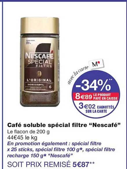 Découvrez dès maintenant la offre Café soluble spécial filtre “Nescafé” dans le catalogue de Monoprix. Cette offre est valable du 21/10/2025 au 02/11/2025.