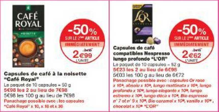 Découvrez cette incroyable promotion sur les capsules de café à la noisette "Café Royal" et les capsules compatibles Nespresso "LOR". Ces offres sont parfaites pour les amateurs de café qui souhaitent savourer une tasse de qualité tout en faisant des économies. Disponibles jusqu'au 6 avril 2025, ces capsules sont le choix idéal pour vos pauses café ou pour recevoir vos amis.