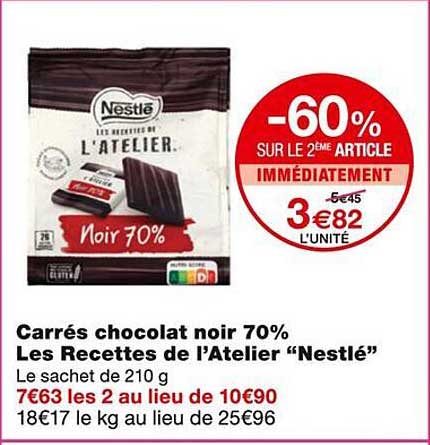 Découvrez l'offre de Carrés Chocolat Noir 70% Les Recettes De L'atelier "Nestlé" chez Monoprix! Cette offre fantastique est maintenant disponible dans le nouveau catalogue de Monoprix. Profitez de cette occasion et économisez considérablement sur votre achat.
