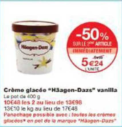 Découvrez notre délicieuse crème glacée "Häagen-Dazs" à la vanille. Pour les amateurs de desserts glacés, cette offre fait partie des meilleures qui soient. Profitez d'une réduction de 50% sur le deuxième article, rendant cette expérience encore plus savoureuse.