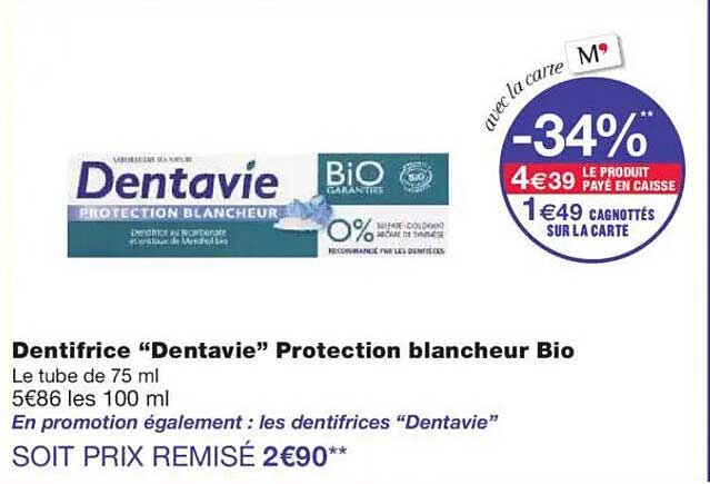 Découvrez dès maintenant la offre Dentifrice "Dentavie" Protection blancheur Bio dans le catalogue de Monoprix. Cette offre est valable du 21/10/2025 au 02/11/2025.