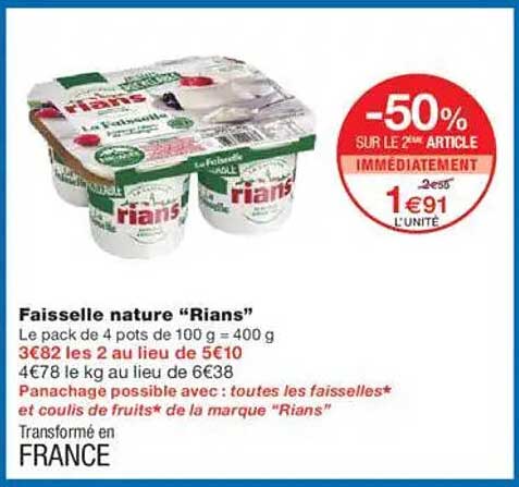 Profitez d'une offre irrésistible sur la faisselle nature "Rians" ! Ce produit emblématique, présenté en pack de 4 pots de 100 g chacun, soit 400 g au total, est l'ingrédient parfait pour vos recettes. Que ce soit pour un dessert léger, un apéritif ou même un plat cuisiné, cette faisselle allie légèreté et onctuosité, idéale pour toute la famille.