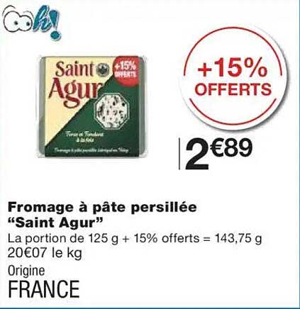 Vous aimez les fromages savoureux et crémeux ? Ne cherchez pas plus loin ! L'offre exceptionnelle sur le fromage à pâte persillée "Saint Agur" est faite pour vous. Avec 15 % offerts, c'est l'occasion rêvée de savourer ce délice à un prix imbattable. Pourquoi attendre pour vous faire plaisir ?