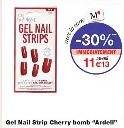 Découvrez dès maintenant la offre Gel Nail Strip Cherry bomb “Ardell” dans le catalogue de Monoprix. Cette offre est valable du 21/10/2025 au 02/11/2025.