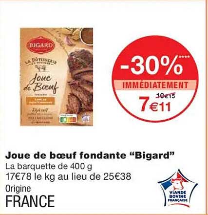 Découvrez la joue de bœuf fondante Bigard, un produit d'exception qui ravira les amateurs de viande. À seulement 7€11 pour une barquette de 400 g, cette offre représente une excellente opportunité pour préparer des plats savoureux et réconfortants.