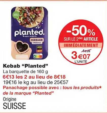 Découvrez une offre incroyable sur le Kebab "Planted" de 160 g, idéal pour ceux qui recherchent des alternatives végétales savoureuses. Profitez d'une réduction exceptionnelle de 50 % sur le deuxième article, ce qui en fait une excellente occasion d'expérimenter ce produit délicieux.