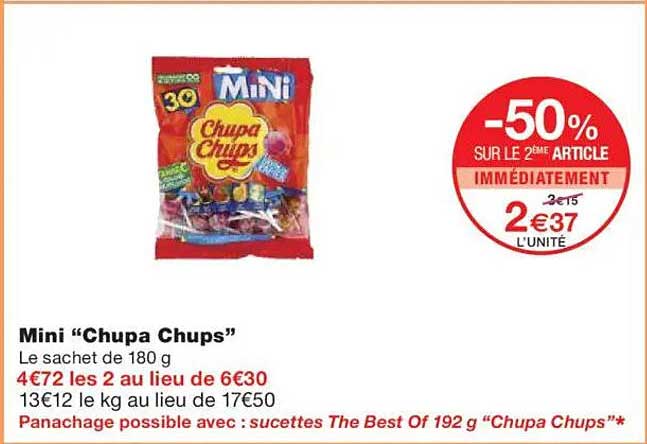 Découvrez l’offre irrésistible sur les Mini "Chupa Chups" ! Ce sachet de 180 g est parfait pour satisfaire vos envies sucrées. Avec 30 mini sucettes à savourer, c'est l'occasion rêvée de partager des moments gourmands en famille ou entre amis.