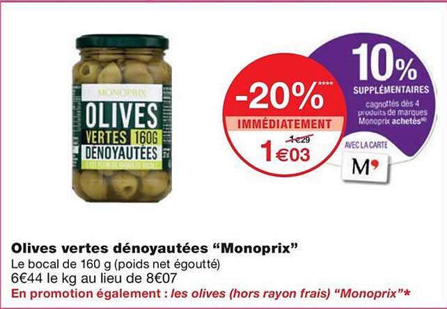 Découvrez l'offre de Olives Vertes Dénoyautées "Monoprix" chez Monoprix! Cette offre fantastique est maintenant disponible dans le nouveau catalogue de Monoprix. Profitez de cette occasion et économisez considérablement sur votre achat.