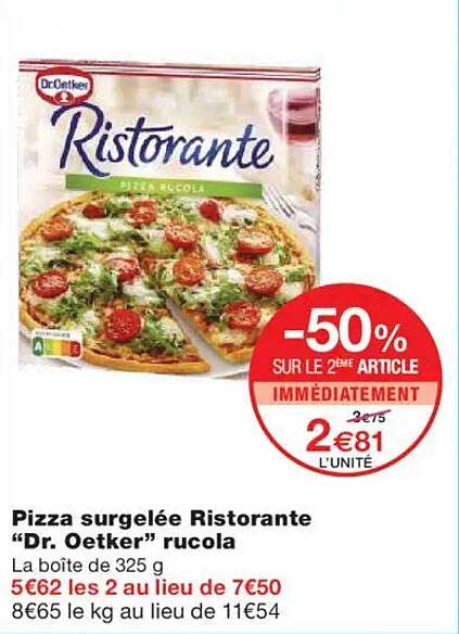 Si vous êtes un amateur de bonnes pizzas, ne manquez pas cette offre incroyable sur la pizza surgelée Ristorante "Dr. Oetker" rucola ! Avec une croûte croustillante et des ingrédients frais, cette pizza est parfaite pour un dîner rapide ou une soirée entre amis. La promotion actuelle vous permet de profiter de -50% sur le deuxième article acheté, rendant cette offre encore plus alléchante.