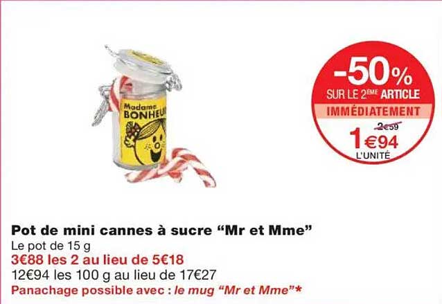 Découvrez dès maintenant la offre Pot de mini cannes à sucre “Mr et Mme” dans le catalogue de Monoprix. Cette offre est valable du 21/10/2025 au 02/11/2025.