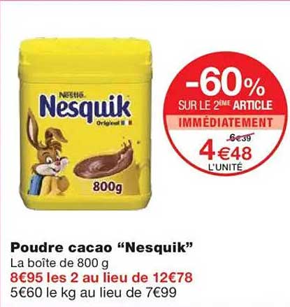 Vous êtes fan de chocolat et de boissons gourmandes ? Ne manquez pas cette incroyable offre sur la poudre cacao Nesquik ! Avec une promotion exceptionnelle de -60% sur le deuxième article, cette boîte de 800 g est parfaite pour réaliser vos boissons chocolatées préférées à tout moment de la journée. C'est une occasion à ne pas rater pour faire le plein de saveurs sans se ruiner.