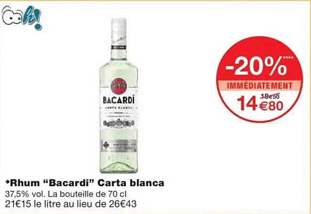 Normalement proposé à 18,50 €, le Bacardi Carta blanca est actuellement en promotion à 14,80 €, vous réalisant ainsi une économie substantielle de 20%. De plus, le prix par litre, qui est désormais de 21,15 € au lieu de 26,43 €, vous assure un excellent rapport qualité-prix.