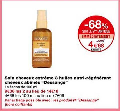 Découvrez l'offre de Soin Cheveux Extrême 3 Huiles Nutri-Régénérant Cheveux Abîmés "Dessange" chez Monoprix! Cette offre fantastique est maintenant disponible dans le nouveau catalogue de Monoprix. Profitez de cette occasion et économisez considérablement sur votre achat.