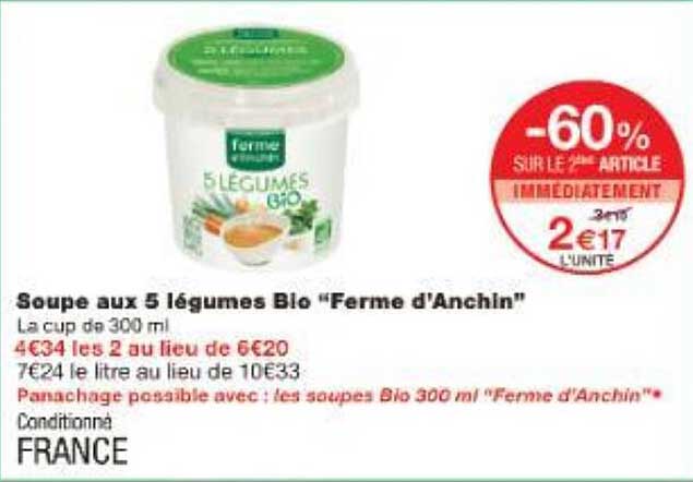 Découvrez la délicieuse soupe aux 5 légumes Bio "Ferme d'Anchin", une option saine et savoureuse pour vos repas. Profitez d'une réduction exceptionnelle de 60% sur ce produit, idéal pour les amateurs de cuisine bio. En période de rush, rien de mieux qu'une bonne soupe pour vous réchauffer et régaler vos proches.