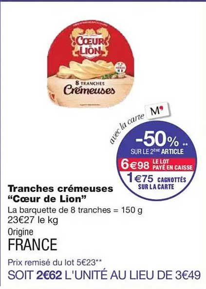 Découvrez dès maintenant la offre Tranches crémeuses "Cœur de Lion" dans le catalogue de Monoprix. Cette offre est valable du 21/10/2025 au 02/11/2025.