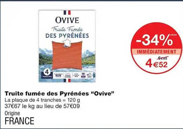Découvrez dès maintenant la offre Truite fumée des Pyrénées "Ovive" dans le catalogue de Monoprix. Cette offre est valable du 21/10/2025 au 02/11/2025.
