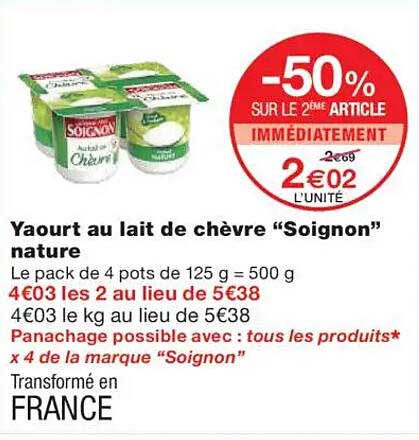 Découvrez notre promotion sur le yaourt au lait de chèvre "Soignon" nature, un produit délicieux et sain qui ravira vos papilles. Profitez de cette offre impérative du 21 octobre au 2 novembre 2025, idéale pour les amateurs de produits laitiers de qualité.