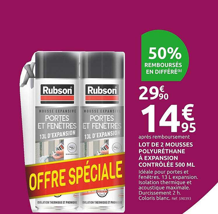 Démarrez vos projets de bricolage avec une offre incroyable sur les mousses expansives Rubson, idéales pour l'isolation de vos portes et fenêtres. Cette offre permet non seulement de réaliser des économies importantes, mais aussi de bénéficier d'un produit de qualité, essentiel pour assurer une isolation thermique et phonique optimale dans votre maison.