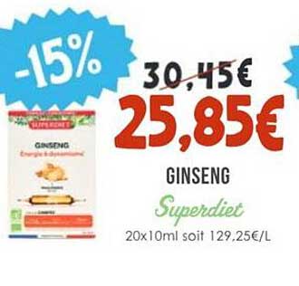 Initialement vendu à 30,45€, le prix promotionnel de 25,85€ constitue une économie de 15%. Vous faites non seulement le choix d'un produit de qualité, mais également celui d'une offre avantageuse. C'est l'occasion rêvée d'ajouter cet extrait de Ginseng à votre routine quotidienne sans vous ruiner.