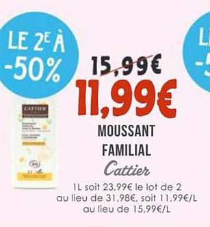 Découvrez le Moussant Familial Cattier, une offre exceptionnelle valable du 1er octobre au 30 octobre 2025. Ce produit est idéal pour toute la famille, offrant une expérience de nettoyage efficace tout en préservant la douce peau de vos enfants. Avec une promotion imbattable, vous ne voudrez pas passer à côté !