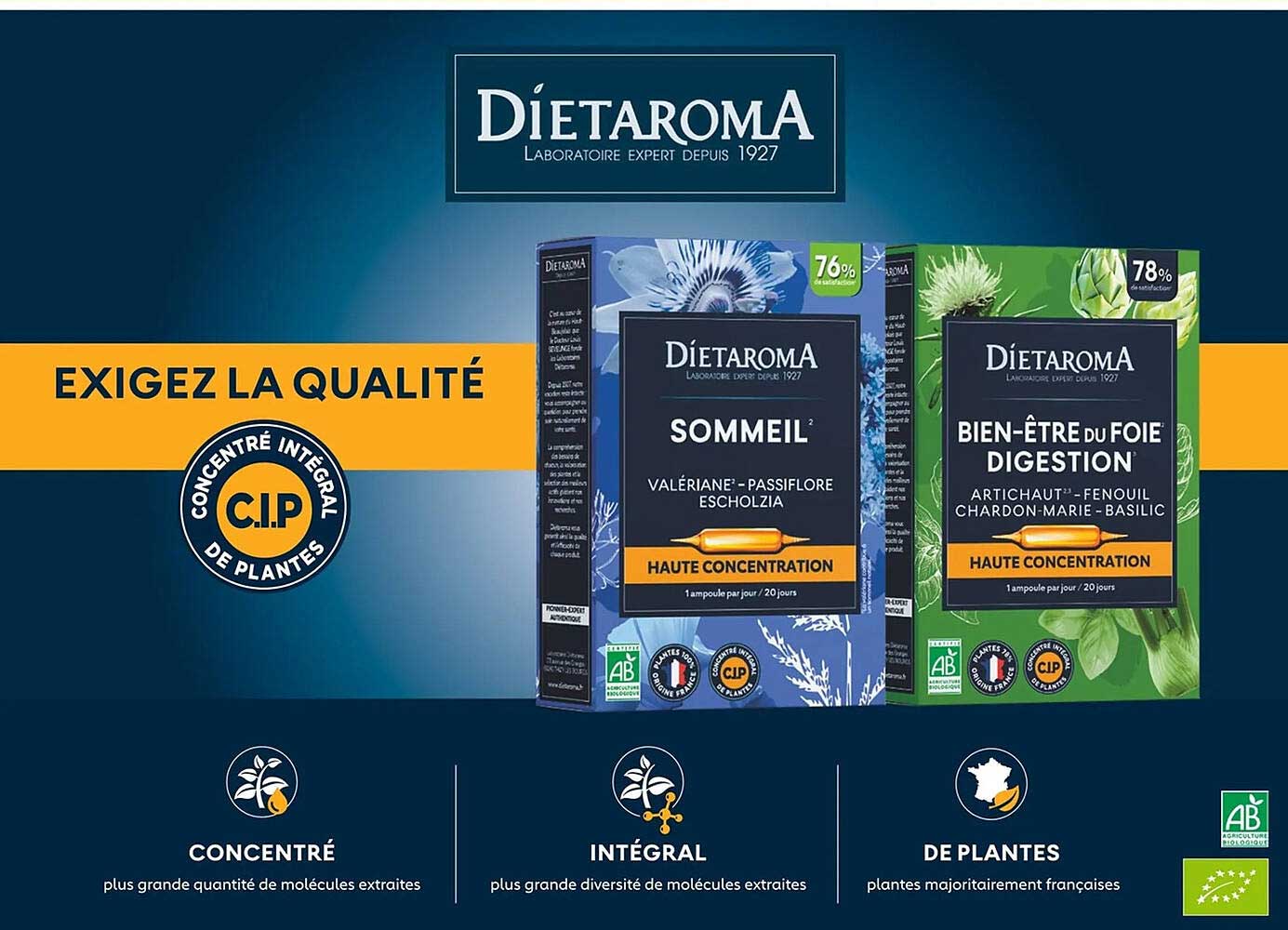 Découvrez les bienfaits des produits DIÉTAROMA, conçus pour améliorer votre bien-être au quotidien. Forts de leur expertise depuis 1927, ces laboratoires vous proposent des solutions naturelles efficaces. Sur cette page, vous trouverez une sélection de leurs offres attractives, en particulier celles qui favorisent le sommeil et la digestion.
